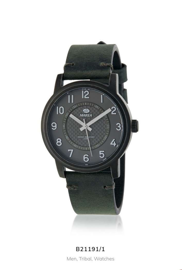Movimiento japonés: 3 agujas Diámetro Caja: 42 mm. Material Caja: Acero Material Brazalete: Piel color verde oscuro Esfera: Color negro Resistente al agua: 5 ATM Colección Tribal