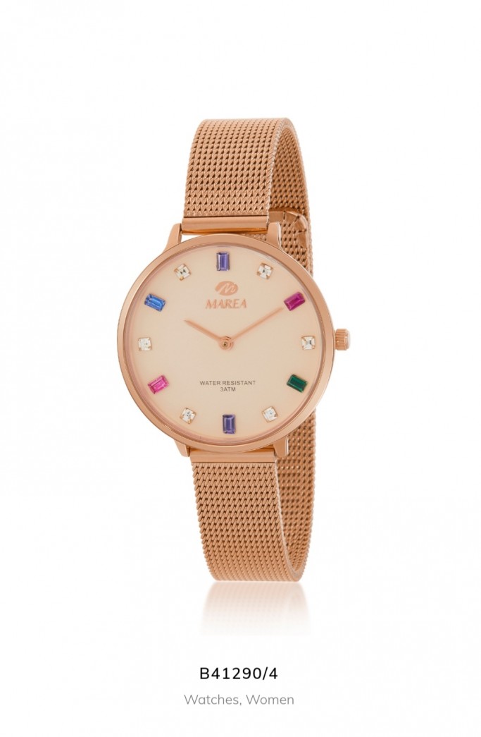 RELOJ MAREA DE MUJER ROSAGOLD CON MALLA MILANESA Y CIRCONITAS DE COLORES EN LA ESFERA