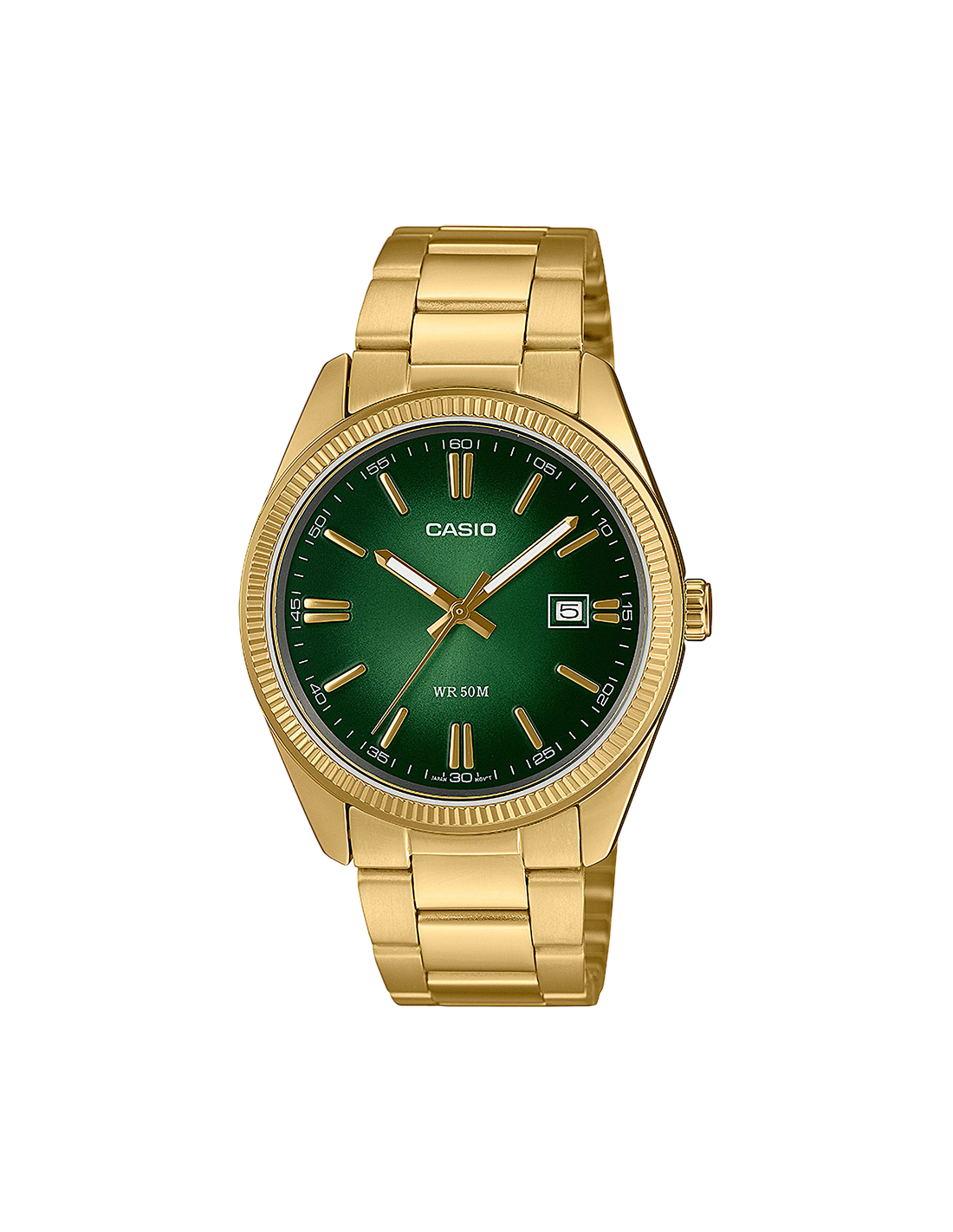 RELOJ CASIO DORADO ANALOGICO PARA HOMBRE Y ESFERA VERDE RESISTENTE AL AGUA