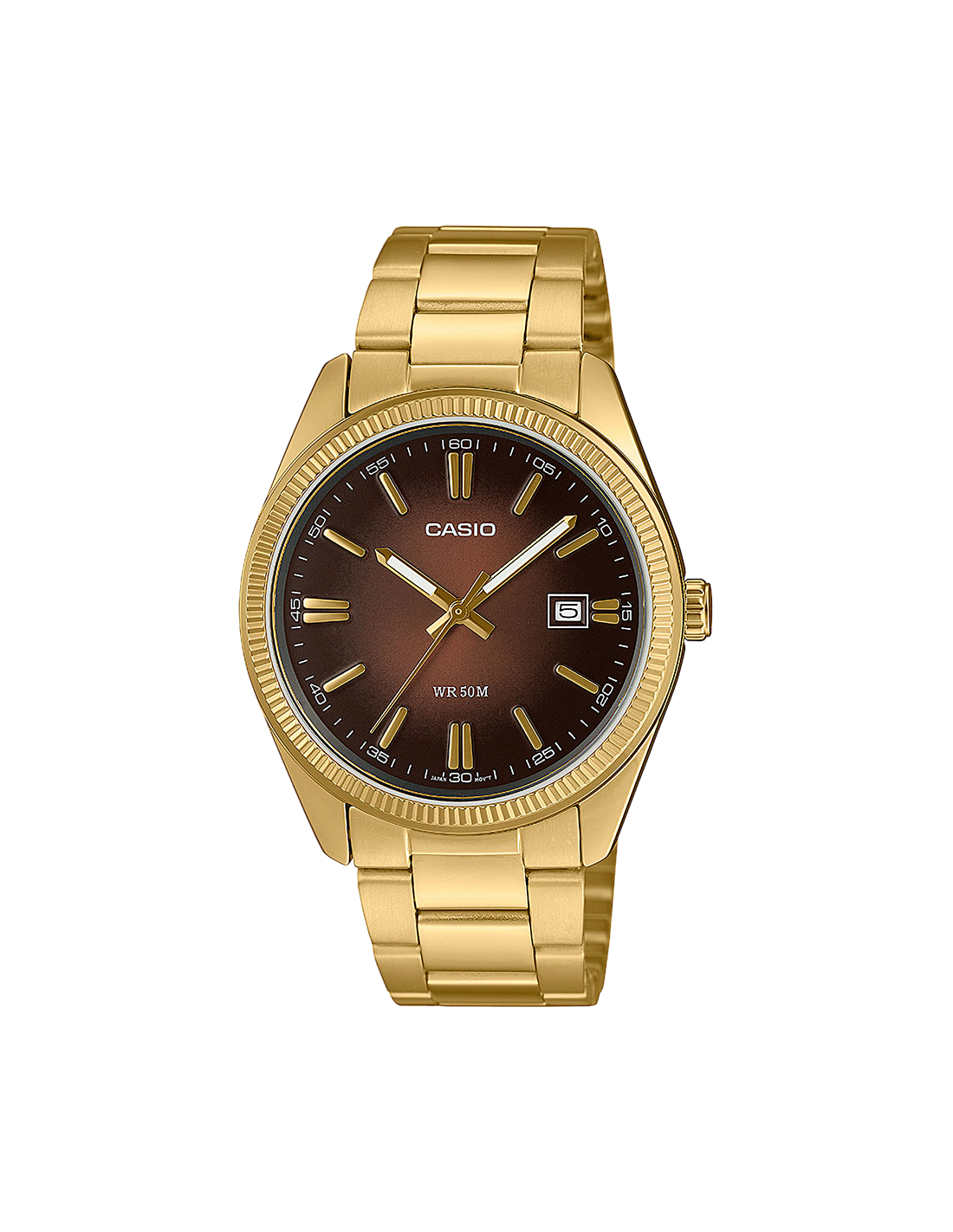 RELOJ CASIO DORADO ANALOGICO PARA HOMBRE Y ESFERA MARRON OSCURO RESISTENTE AL AGUA