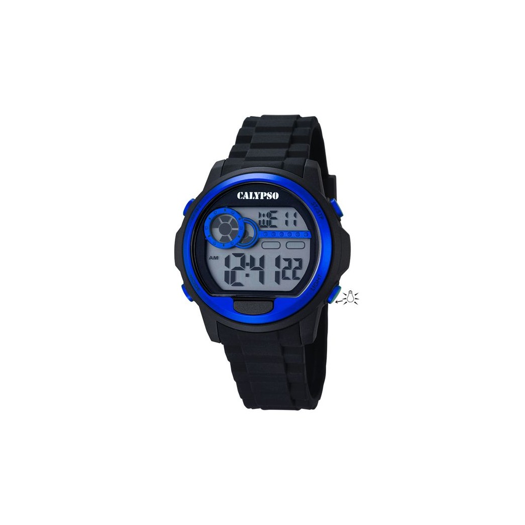 RELOJ CALYPSO DIGITAL NEGRO/AZUL RESISTENTE AL AGUA 100 METROS.